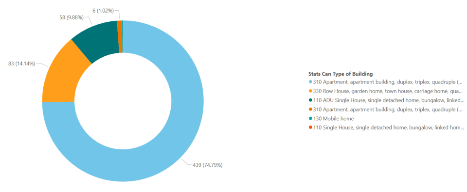 The chart below shows the breakdown of the units created in 2025 by unit type. This shows that the vast majority (74.79%) were apartment buildings including duplex, triplex and quad-plex type units greater than four storeys.  Row houses including garden homes and town house and carriage house are the next largest category at 14.14%.