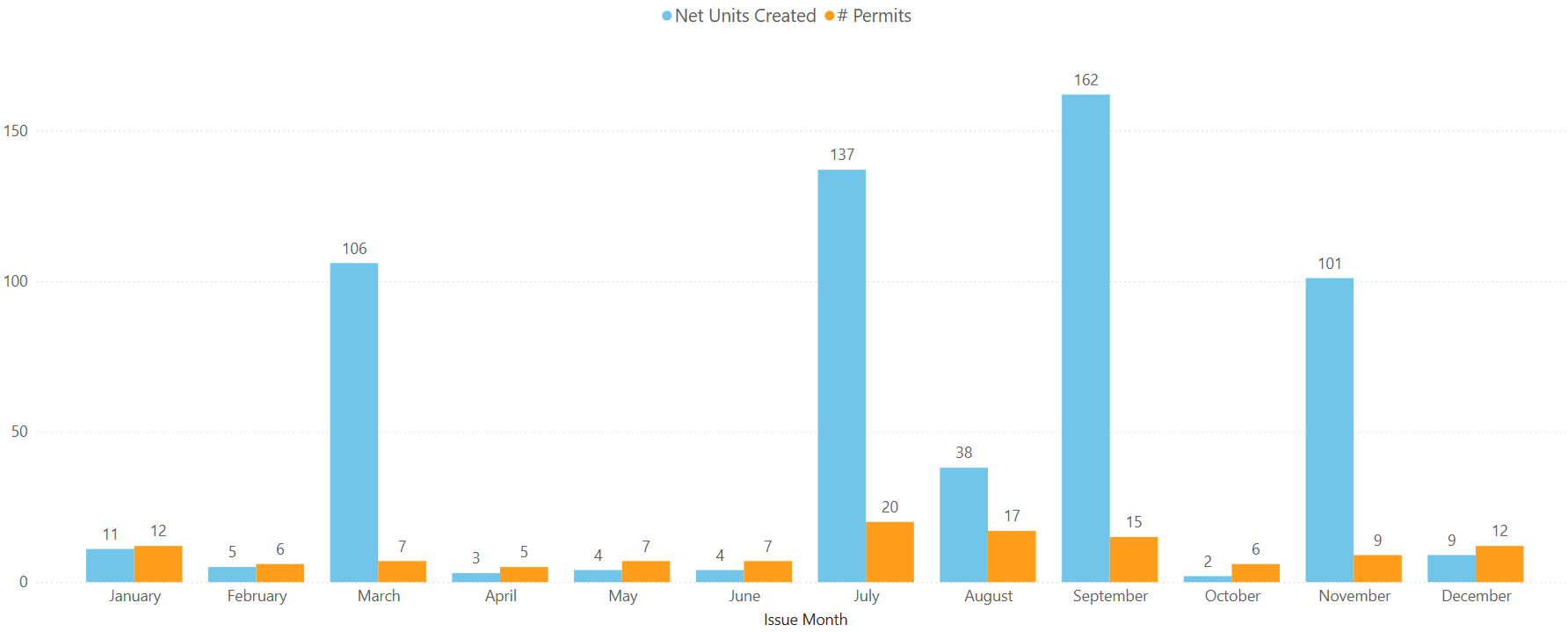 The nature of new home construction is also that it is not evenly spread throughout the year. There is a seasonal nature to the data. The chart below shows the monthly unit count making up the HAF target for 2025. these are Building Permits issued (net of demolished units) for 2025.