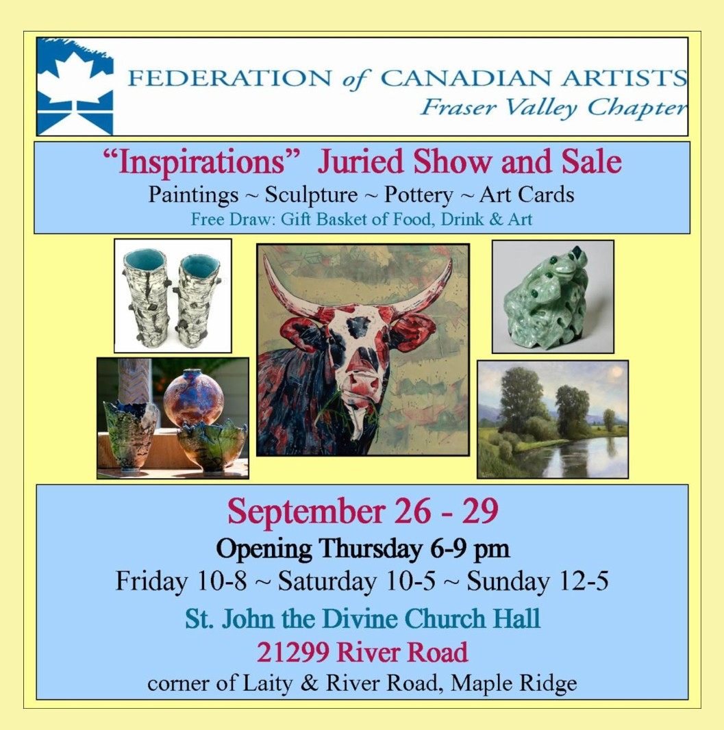 The Federation of Canadian Artists Fraser Valley Chapter is having a Juried Show, September 26 - 29 at St John the Divine Church Hall. The show titled “Inspirations” will include juried paintings and sculpture, as well as local potters who are guest artists.