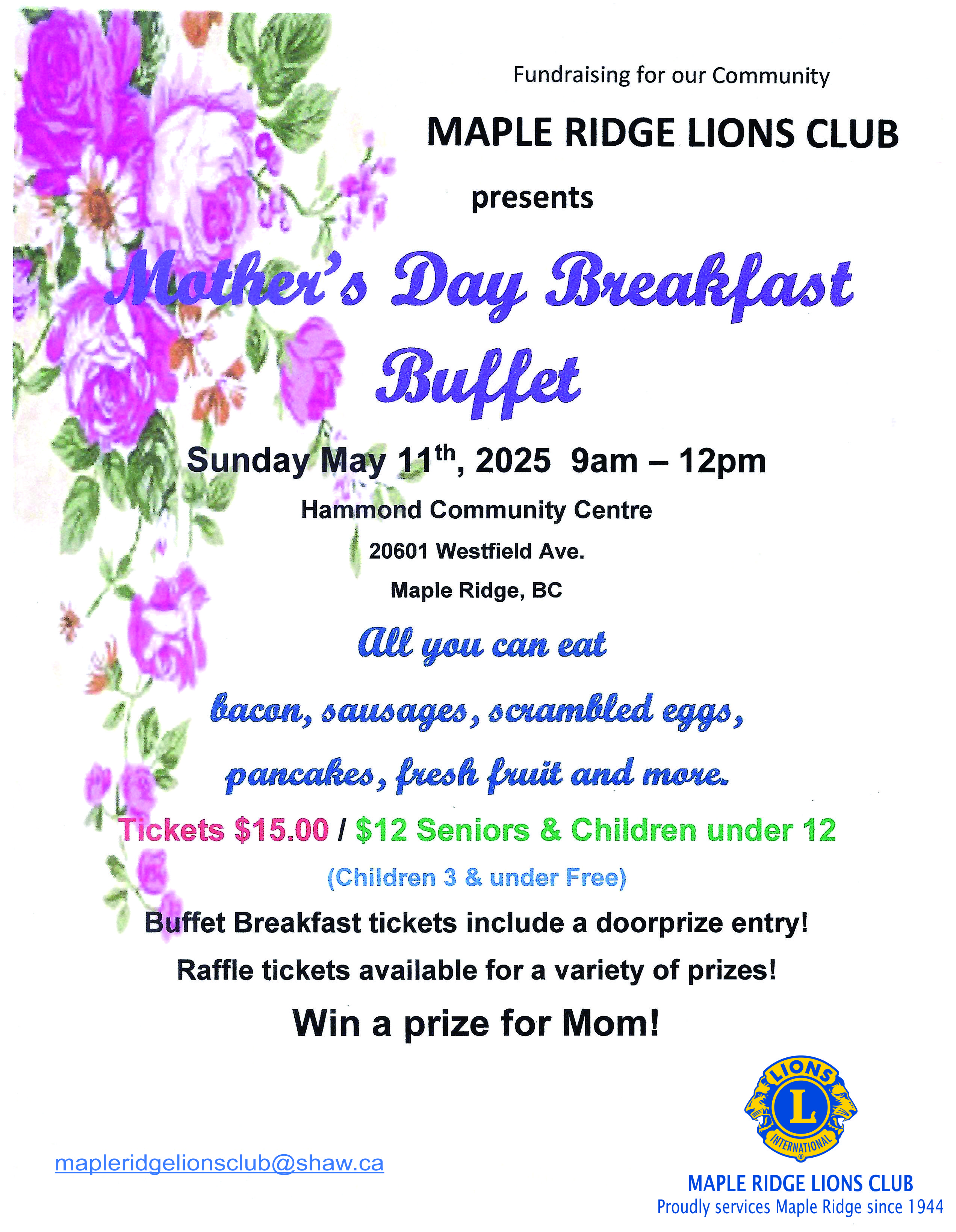 Maple Ridge Lions Club presents a Mother's Day Breakfast Buffet - all you can eat bacon, sausages, scrambled eggs, pancakes, fresh fruit, and more!