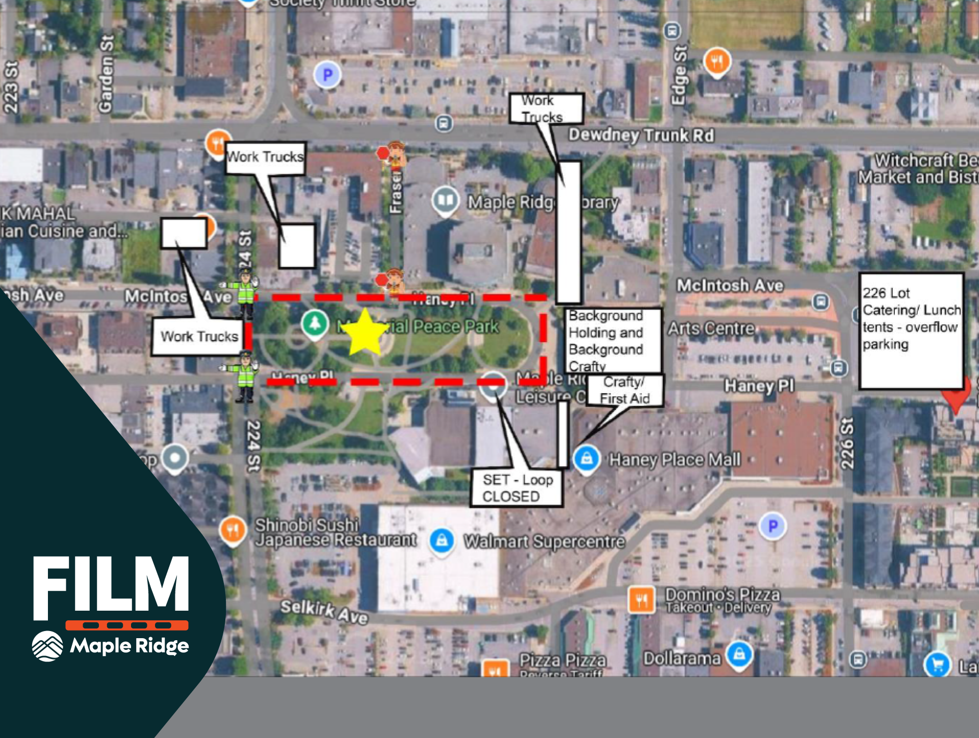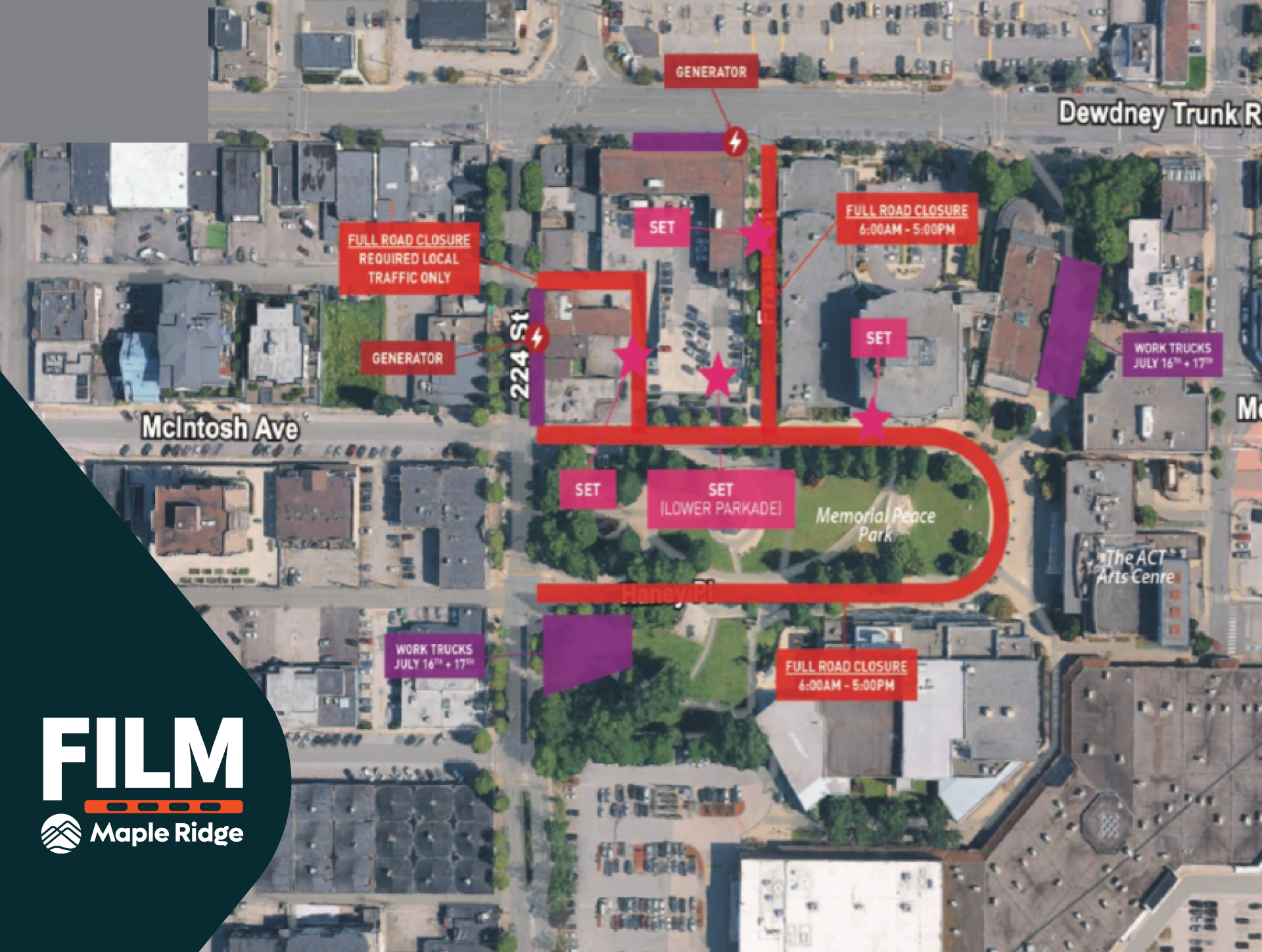 The City of Maple Ridge is advising residents, businesses, and visitors of an upcoming large-scale filming activity in and around Memorial Peace Park. Two major TV productions will be on location, resulting in full road closures and temporary traffic impacts. 224th Street will remain open but may be affected by intermittent traffic lockups for filming. Film crews will not be permitted to use the underground parkade, however parkade access will be limited to Dewdney Trunk Road and Edge Street.