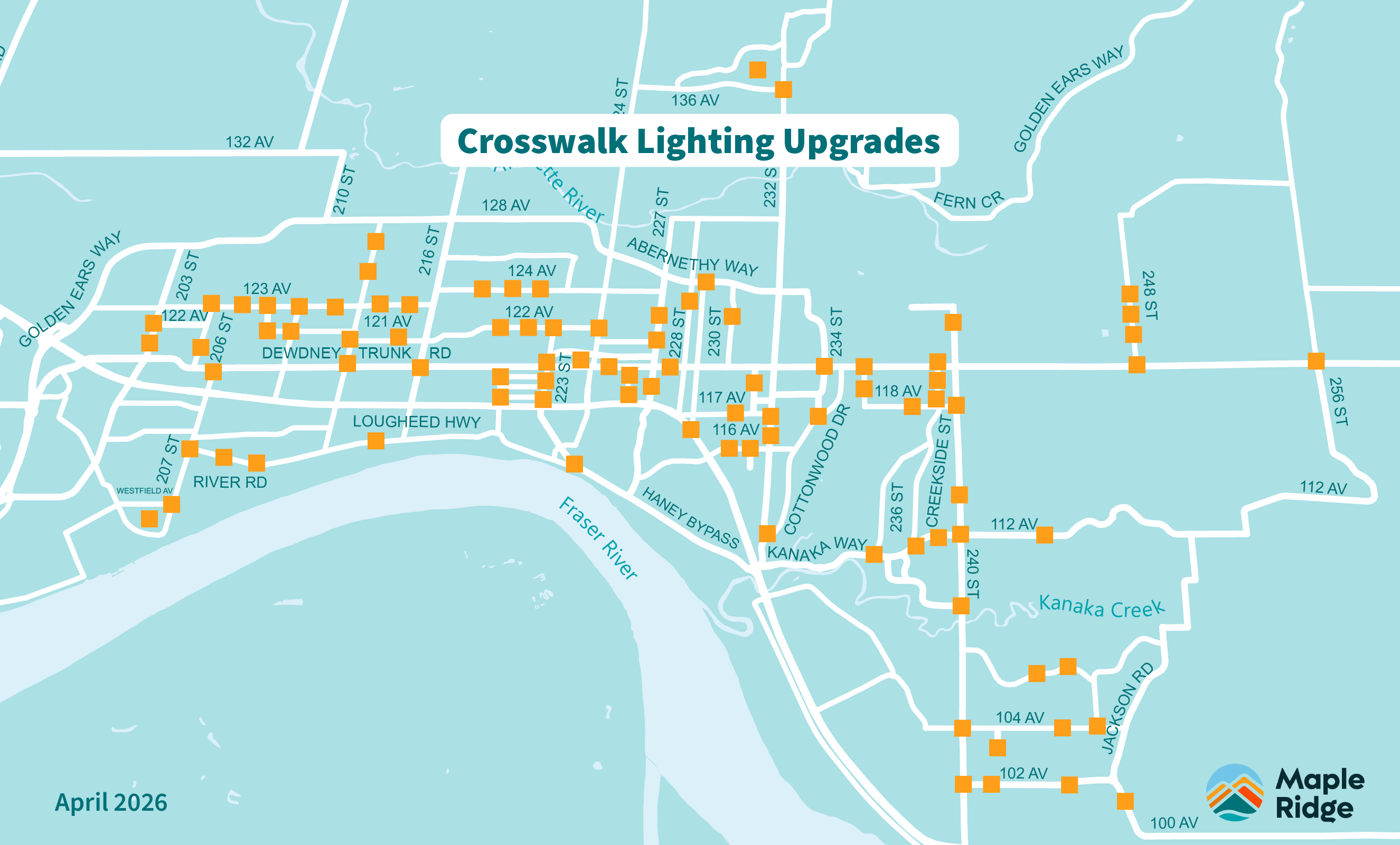 As of April 2026, there are 88 crossing locations throughout Maple Ridge with solar-powered, pedestrian-activated Rectangular Rapid Flashing Beacons (RRFBs). The installations were prioritized at locations identified as high-traffic or safety-priority areas, such as schools and community centres.