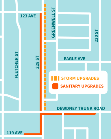 New sanitary sewer mains along 119 Avenue, 228 Street, and Dewdney Trunk Road