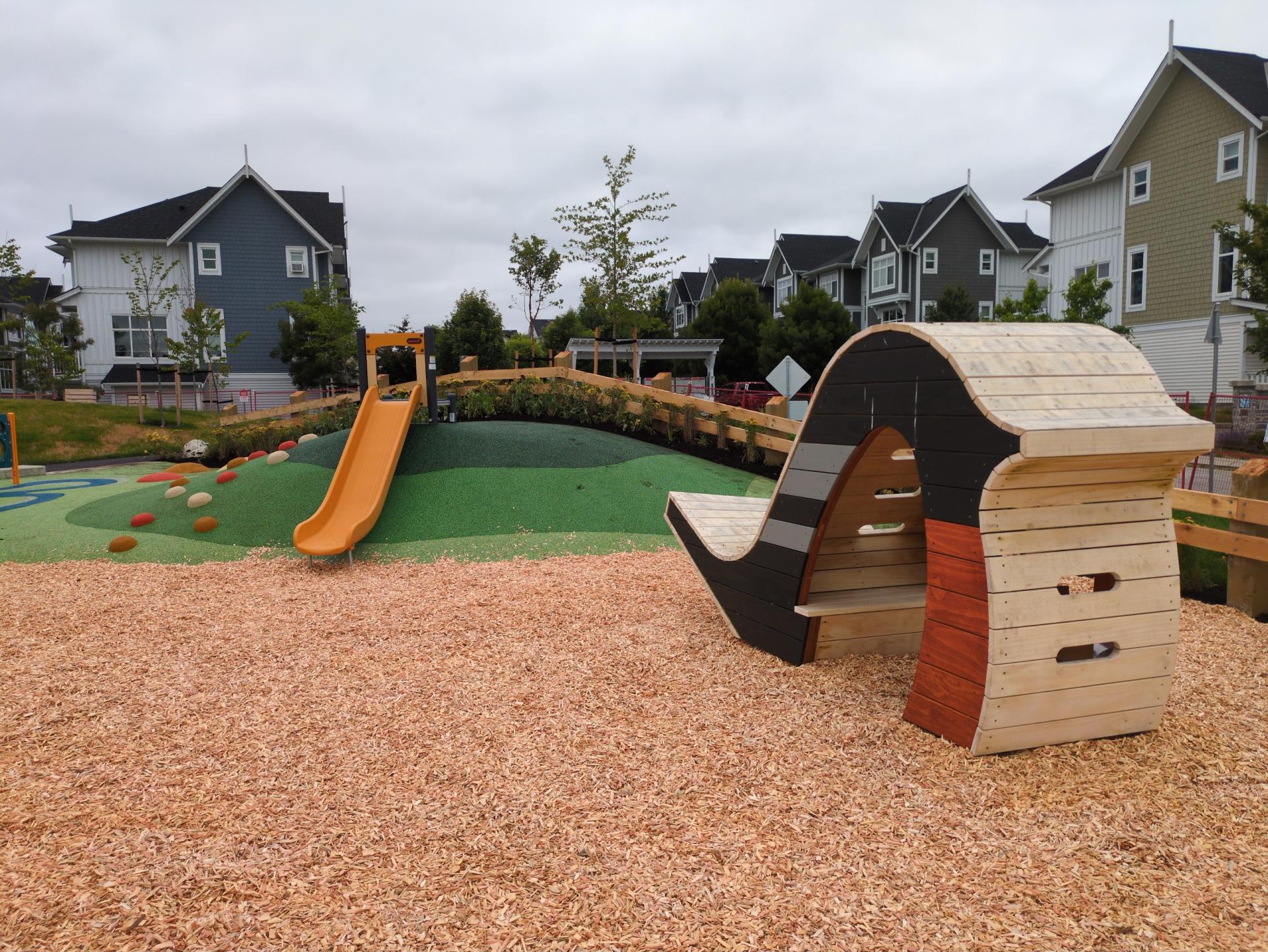 The park’s design reflects community feedback gathered during public engagement in 2023, offering a mix of active play areas, quiet seating spaces, and accessible pathways that weave through natural plantings, a wildflower meadow and rain gardens.